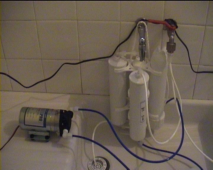 Voici le montage que j'ai fait. J'ai mis un filtre à sédiment en plus, et une pompe surpresseur booster de marque aquariopure. J'ai mis un filtre à sédiment avant l'entrée de l'eau dans la pompe. Avec ce système on arrive à une production d'environ 190 litres par 24 heures.
